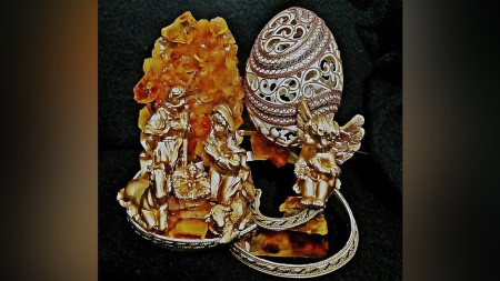 На задньому фоні шопки змайстрована своєрідна стіна з каменю – частин бурштину.«Камінь я побив хаотично і склеїв частини для природного сколу. Також дав підсвітку у двох кольорах: де яйце – синім, а де бурштин – червоним», – провадить майстер.