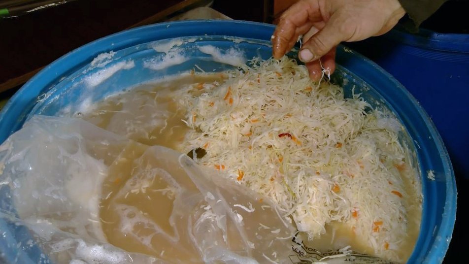 «Можу допомогти? Можу. Сів і поїхав. Хоч маєш багато своєї роботи, але це не виключає те, що ти можеш допомогти», – каже чоловік.Зі слів Олега Галасуна, до початку квашення готує капусту: шинкує її на тертці, а потому додає сіль і спеції та поміщає усе до 200-літрової бочки. Зверху, каже, обов'язково треба покласти камінь або інший важкий предмет.