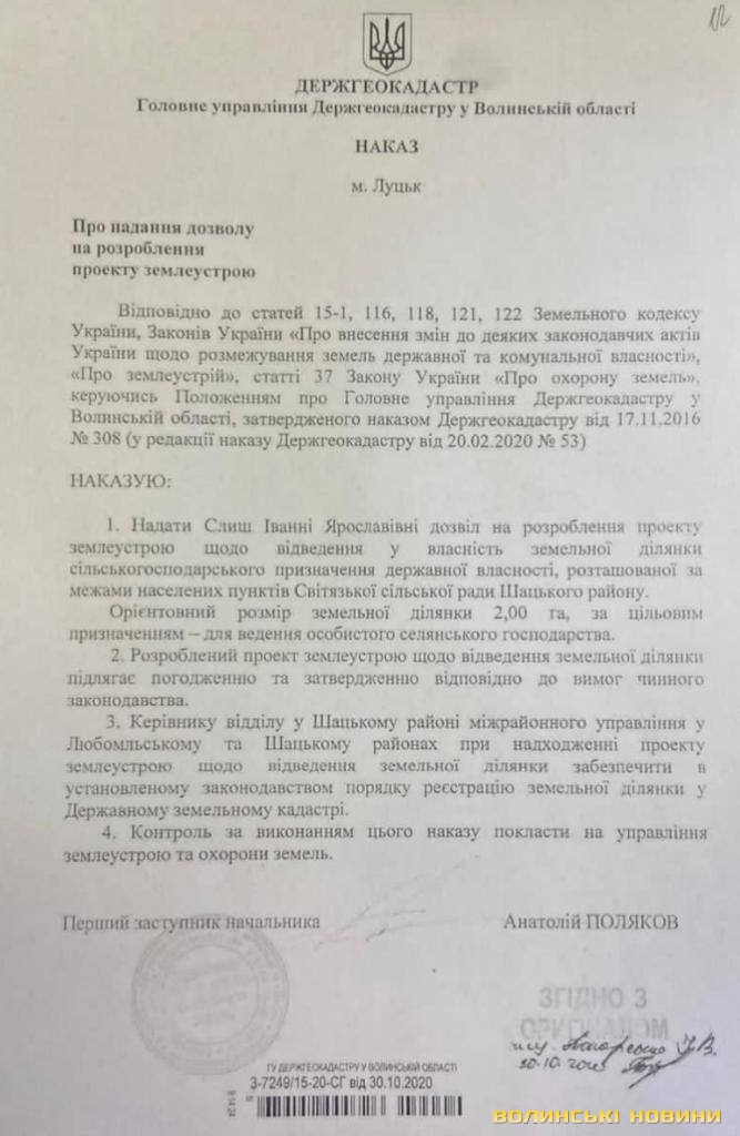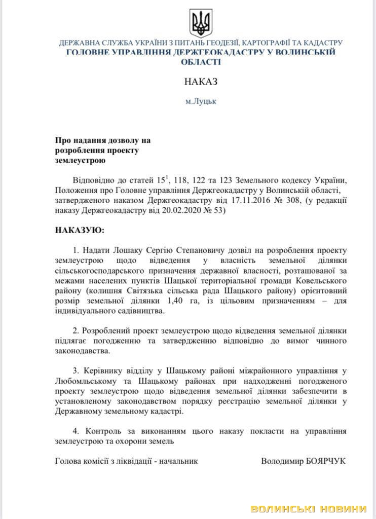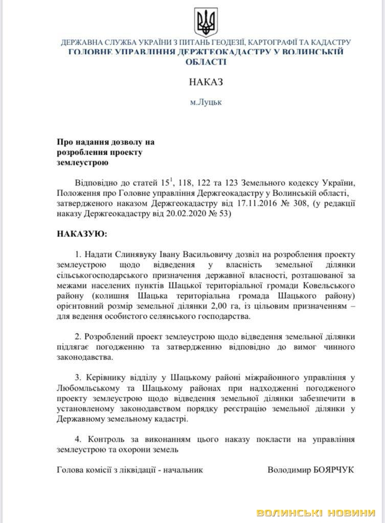 У волинському Держгеокадастрі телефоном їм повідомили про те, що їхні клопотання знаходяться на розгляді в начальника головного управління Володимира Боярчука. Згідно зі ст. 118 Земельного кодексу України п.9 уповноважений орган у двотижневий строк з дня отримання погодженого проекту із землеустрою приймає рішення про затвердження проекту землеустрою щодо відведення земельної ділянки та надає її у власність.Проте не так сталось, як заявникам гадалось. Ці ж ділянки керівник Держгеокадастру Волині вирішив віддати іншим людям, штучно створивши між ними конфлікт. На сайті Головного управління Держгеокадастру у Волинській області у розділі «Оприлюднення наказів» з'явились накази 317-убд та 316-убд від 30.03.2021 підписані Володимиром Боярчуком, згідно з якими надано дозвіл на розроблення проектної документації іншим атовцям Слинявуку І.В. та Лошаку С.С. на тих самих ділянках, на які раніше надали дозволи попереднім заявникам – Слиш І.Я. та Теглівець М.М.Читати ще: За закритими дверима: як Держгеокадастр дерибанить волинські землі на «відкритих» торгах