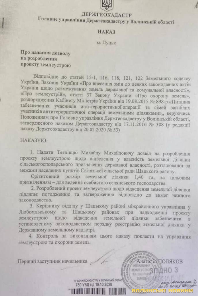 Про це Інформаційному агентству Волинські Новини стало відомо з власних джерел. Так, раніше до Головного управління Держгеокадастру у Волинській області звернулись учасники АТО/ООС Теглівець М.М. та Слиш І.Я. із погодженими проектами та заявами для затвердження таких проектів із землеустрою щодо відведення земельної ділянки у власність для ведення особистого селянського господарства на території Шацькоі ОТГ. Зокрема, Теглівець М.М. звертався 15 січня 2021 р., а Слиш І.Я. ще 30 листопада 2020 р.