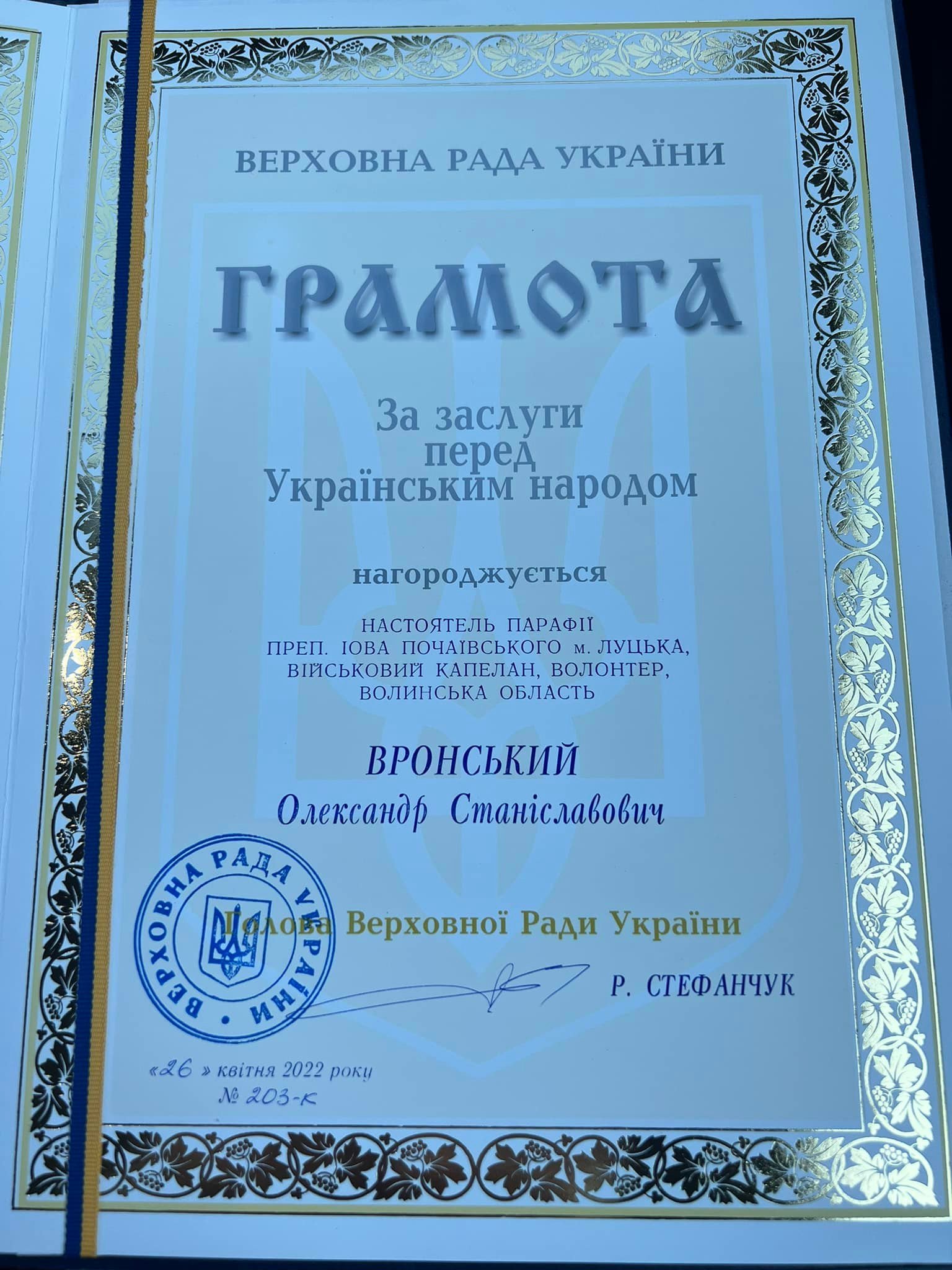 Народний депутат України від Волині Ірина Констанкевич вручила грамоту «За заслуги перед українським народом» настоятелю парафії преподобного Іова Почаївському Луцька, військовому капелану та волонтеру Олександру Вронському.