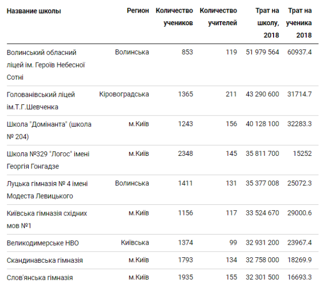 Так, у п’ятірку закладів із найбільшим держфінансуванням увійшли: Волинський обласний ліцей ім. Героїв Небесної Сотні, Голованівський ліцей ім. Тараса Шевченка (Кіровоградська область), школа «Домінанта» (Київ), школа № 329 «Логос» ім. Георгія Гонгадзе (Київ), гімназія № 4 ім. Модеста Левицького (Луцьк).