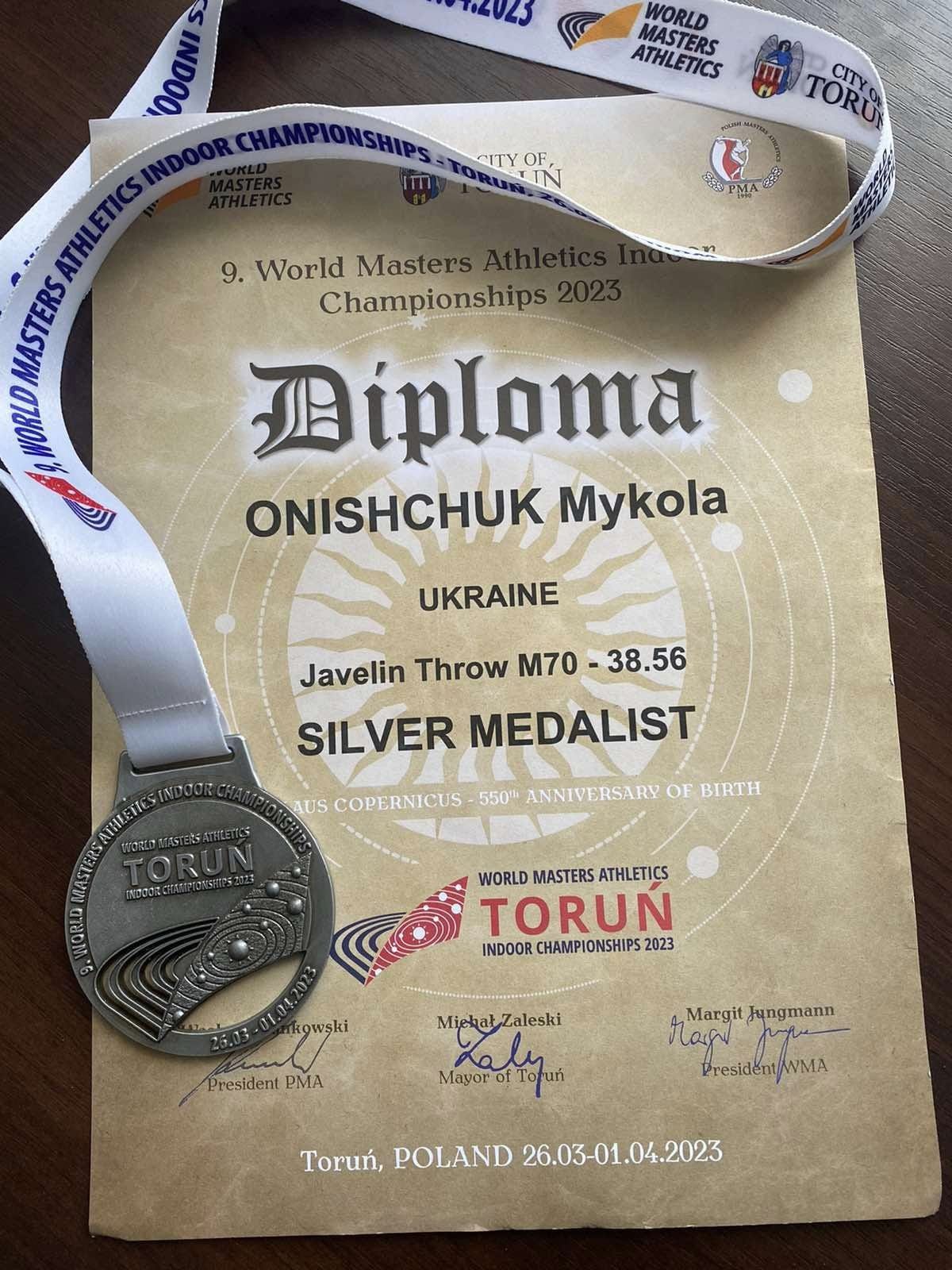 У сектор для метання списа вийшло 17 атлетів. Срібло волинянину у віковій категорії М70 принесла завершальна спроба на 38,56 м. Конкуренція у цих змаганнях була жорсткою. Чемпіона від другого місця віддалили 25 см.До слова, чотири роки тому в Торуні на попередньому ЧС серед ветеранів Микола Оніщук здобув у метанні списа бронзову нагороду в категорії М65.Участь в чемпіонаті стала ще однією можливістю розповісти про війну московитів проти України. Багато учасників чемпіонату світу розпитували пана Миколу про події в Україні та висловлювали йому підтримку.