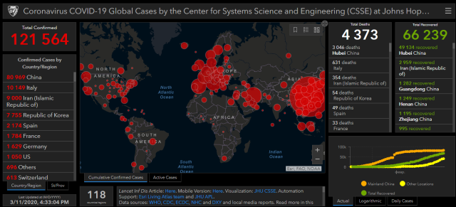 Станом на 19:00 11 березня було 121 564 підтверджених випадків вірусу, 4 373 смертей і 66 239 видужали.Дані в режимі реального часу.