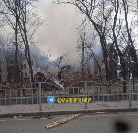 Окупанти з Росії цілеспрямовано знищили драматичний театр у центрі Маріуполя, де ховалися сотні людей. Уламками завалило вхід до бомбосховища. Кількість постраждалих невідома, адже в місті тривають бої.