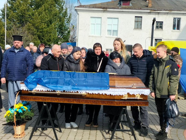 Навколішки та з квітами у руках зустрічали загиблого захисника України жителі громади, а тужлива мелодія «Плине кача» вкотре розривала серце і душу кожного, хто прийшов у цей день на майдан віддати останню шану Героєві.