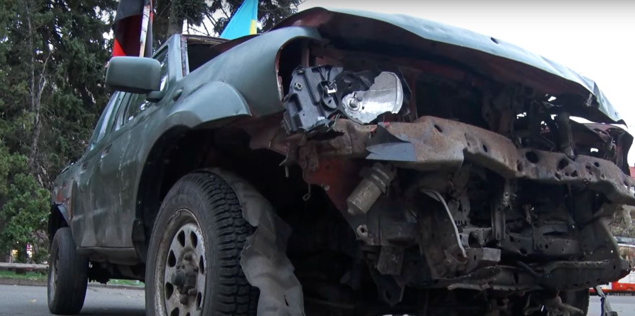 Понівечений автомобіль стоїть біля головного корпусу Волинського національного університету. Волонтер з Рожища Владислав Демянчук привіз транспорт із Куп'янська на Харківщині. Автівкою їздили волинські бійці з 14-ї бригади, допоки не потрапили на ній під танковий обстріл, ідеться в сюжеті 12 каналу.