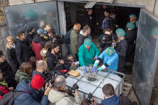 У селищі Винники, що на Львівщині, 26 лютого розпочали найбільшу публічну утилізацію нелегального алкоголю. У заході взяв участь глава Мін’юсту Денис Малюська. Саме він відкоркував першу пляшку підробленої горілки.