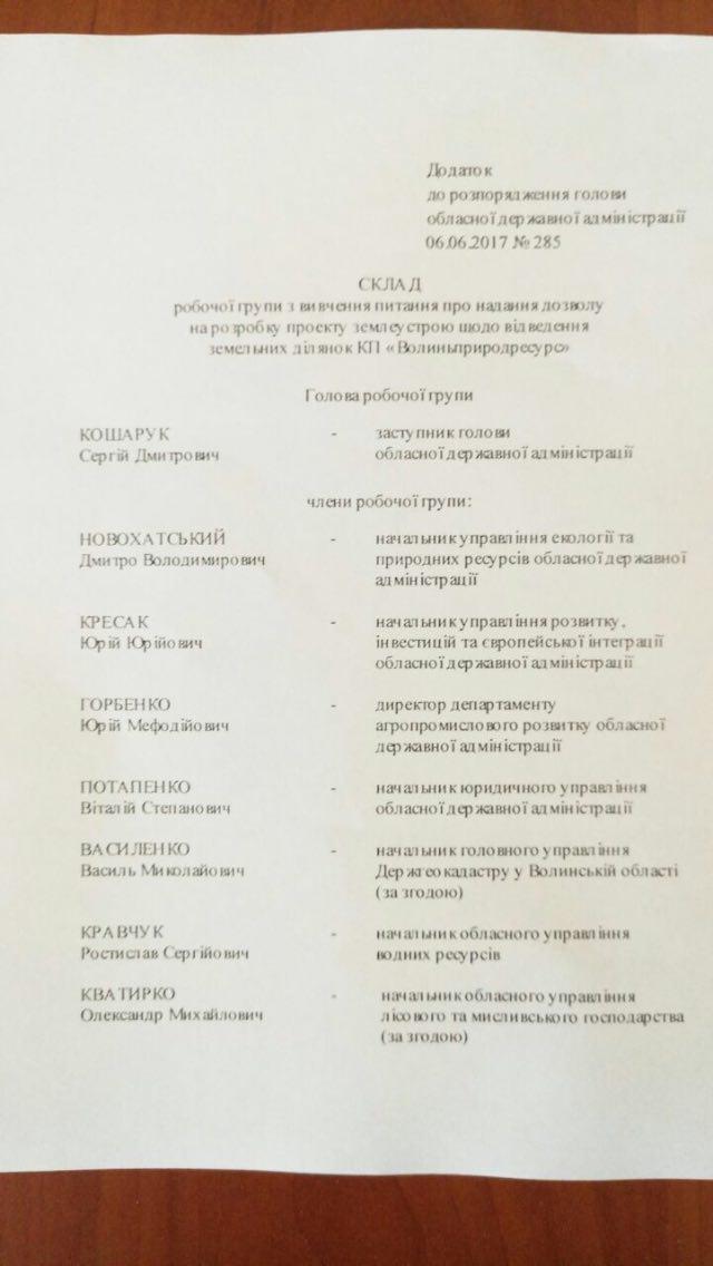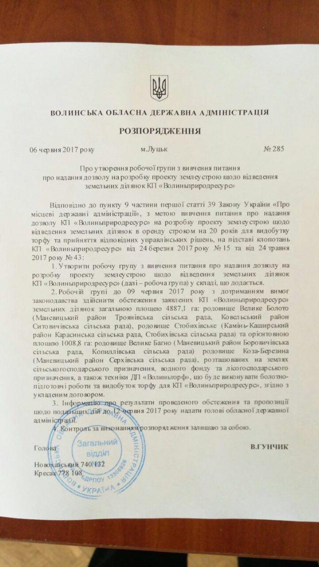 Сьогодні, 8 червня, о 9:10 у ДП «Волиньторф» надійшов факс з Волинської ОДА – розпорядження губернатора Володимира Гунчика «Про утворення робочої групи з вивчення питання про надання дозволу на розробку проекту землеустрою щодо відведення земельних ділянок КП «Волиньприродресурс».