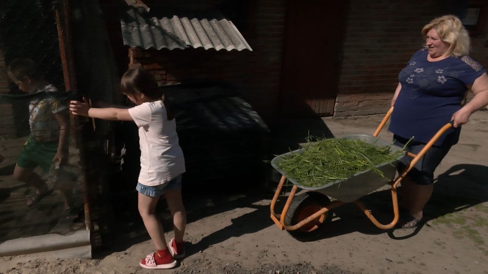 «Часом важко, але діти допомагають. Мусимо їх вчити, щоб допомагали. Так само і Танюшу глядіти. Вона очима усе покаже, що вона хоче, що їй подобається. Любить увагу, любить, щоб з нею говорили», – розповідає багатодітна матір Наталія Рибачук.Поки батько на роботі, усі клопоти у догляді за дітьми і домашні справи бере на себе мама.Родина тримає курей, гусей, свиней, собаку та кота. Порають господарство усі разом.На городі Наталія разом із доньками сіє огірки та обробляє грядки з цибулею.Крім хатніх справ, кожен член родини має і власне захоплення. Діти добре навчаються у школі, співають, танцюють та грають на музичних інструментах. Родина відпочиває теж разом.