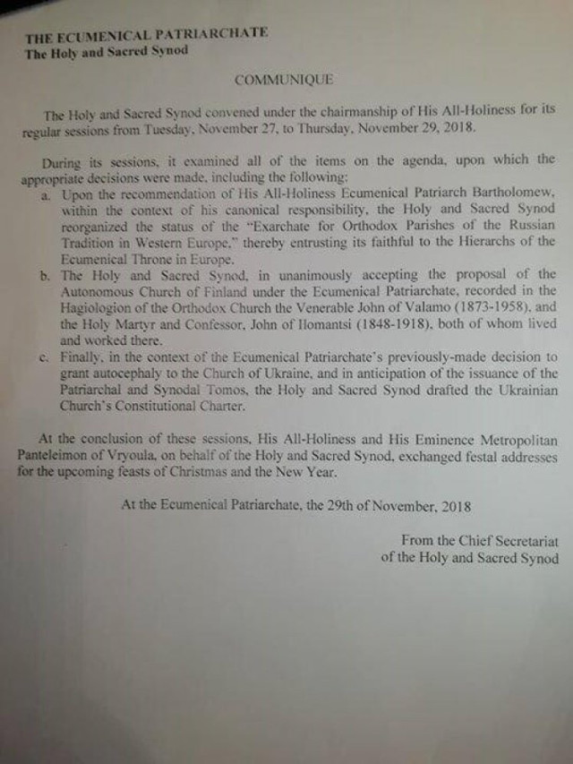 11 жовтня синод Вселенського патріархату ухвалив рішення надати Томос про автокефалію православній церкві в Україні. Тепер у Києві має бути скликано Собор за участю архієреїв УПЦ КП, УАПЦ, а також УПЦ МП, які звернулися до Вселенського Патріарха з проханням про Томос. Собор здійснить церковне об’єднання, утворивши єдину помісну УПЦ, і обере її предстоятеля. Після цього відбудеться отримання предстоятелем єдиної помісної автокефальної УПЦ Томоса як документа (грамоти).