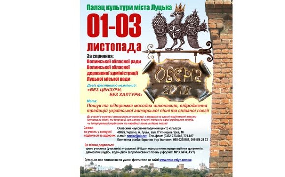 Всеукраїнський фестиваль співаної поезії та авторської пісні «Оберіг» відбудеться 1-3 листопада у Палаці культури Луцька.