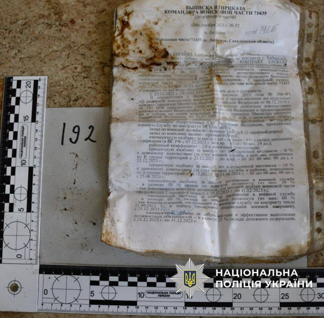 Труп № 192/25. Одягнений у форму зразка збройних сил росії. При ньому – паспорт громадянина рф, військовий квиток, талон атестату військовослужбовця № 1252, виписки з наказу командира в/ч № 52 від 26.12.2023, жетон з написом: «ВС РОССИИ МТ-146004».