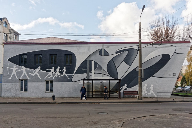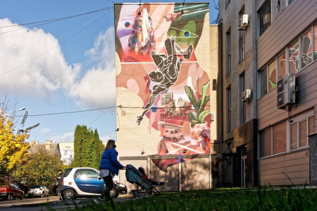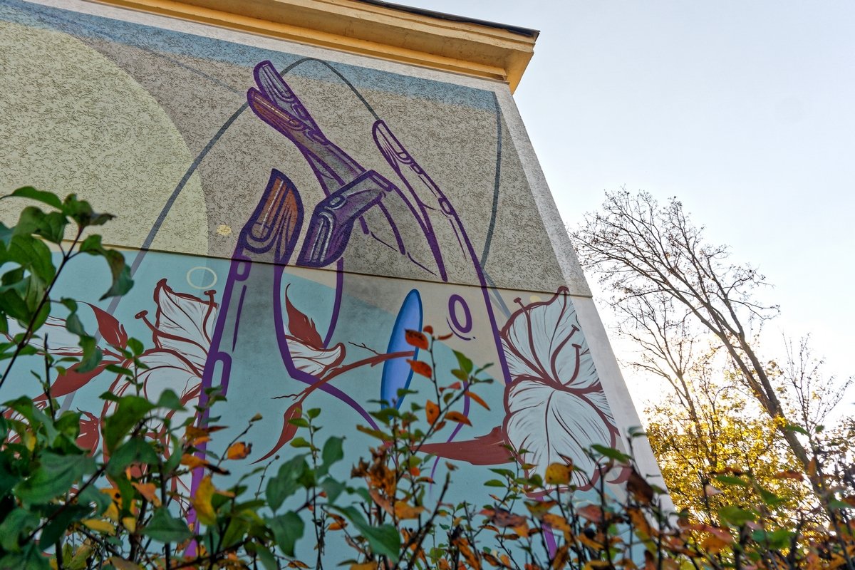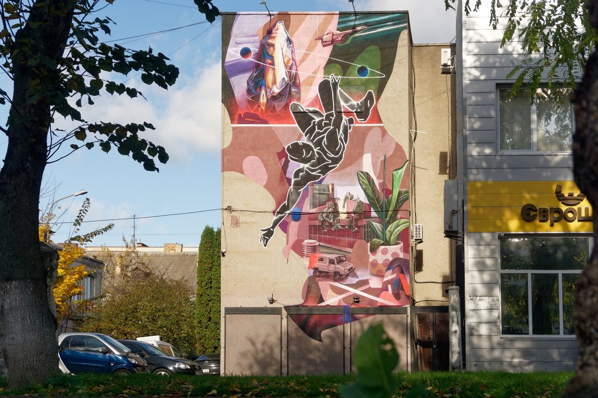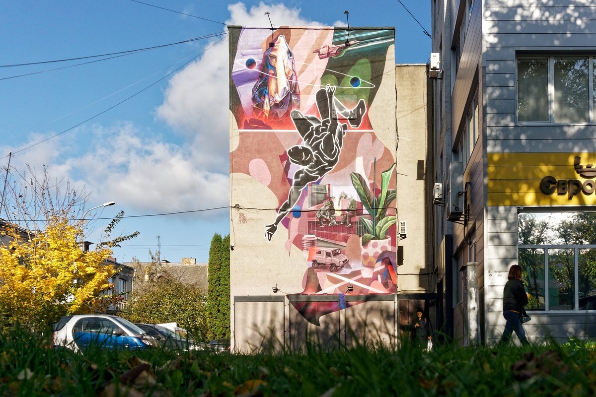 На цокольній стіні будівлі Волинського національного університету імені Лесі Українки, що на вулиці Винниченка, 30, митець зі Львова Тарас Довгалюк створив мурал, який має назву «Споглядання» й від якого справді важко відвести погляд.«Споглядання – це процес, коли певна дія перебуває під увагою та спонукає до осмислення. Тут відбуваються роздуми та перегляд цінностей, – міркує автор роботи Тарас Довгалюк. – Міста – це ті простори, де багато людей переплітаються, співіснують, конфліктують і все ж таки знаходять шляхи для спільного існування. Це ті бетонні джунглі, де діють ті самі закони виживання та пристосування, як і в дикому середовищі. Але цей світ існує поза містами, і без нього містам не вижити. Без нього ми втрачаємо себе. Губимося в штучному середовищі, що не зможе дати нам душевної гармонії. Тої, яку природа викарбовувала мільйонами років. Ми можемо її втратити через власну неувагу, байдужість, корисливість. Зображення, яке непритаманне міським джунглям, надіюся, буде спонукати зупинитися, поглянути, згадати і відчути цінність екосистеми, яка є немов оболонка навколо штучно створеного середовища. Ми всередині, ми не всесильні, ми маємо знайти гармонію. Маємо відчувати відповідальність і пам’ятати, що за нами споглядають ззовні».На історичній будівлі, що на вулиці Шопена, 16, лучанин Сергій Радкевич створив роботу «Рівновага», яка наповнена напрочуд глибокою символікою.«Першим завданням цього розпису є організація території, а також врівноваження та відновлення цільності площини засобом муралу. Ця будівля є частиною історичної спадщини, на жаль, вона втратила свій первинний вигляд. Тому було обрано легке тональне та колірне вирішення, зі спокійною лінійною графікою, щоб зібрати всі фактури, нанесені як утеплення, у єдине зображення, – розповідає Сергій Радкевич. – Стіну було вирішено як умовний простір, що презентує набір символів, взятих з цього середовища, та які висвітлюють тему сталого розвитку урбаністичних локацій. Домінувальними елементами у муралі є кола, що повторюють колишній мурований дах над первинним входом у будівлю. Іконописна РУКА – знак людини-творця. Це особа, яка будує простір для інших, захищає та зберігає природу. Символом природи є квітка, яка немов проростає з людської долоні, це натяк на взаємозв’язок людини та природи. Локальним наративом обрано візерунок з військової уніформи, адже навпроти розташований музей військової техніки. Цей орнамент у роботі перевтілюється в хвилі – як апеляція до реальної річки, що позаду будівлі. Цей символ – знак миру, прагнення до спокою і рівноваги. У муралі також є текст, що закодований шрифтом Брайля. Сюрреалістичний елемент, в якому є слова і зміст, але неможливо прочитати («0 м над рівнем моря» – це власна цитата, яку я часто використовую). У ній ідеться про те, що лінія горизонту згладжує і вирівнює всі нерівності. Це спокій, до якого потрібно прагнути, якого ми потребуємо саме зараз».Колектив художників зі Львова Kickit art studio у складі Віталія Греха, Сергія Греха та Володимира Федусіва на проспекті Волі, 27 зобразив «Квантовий стрибок», робота вийшла не тільки яскравою, а й доволі змістовною.«Робота символізує розвиток планети та суспільства в останні кілька століть. Шляхом художньої мови ми розділяємо композицію на два середовища. Нижня частина складаєть
