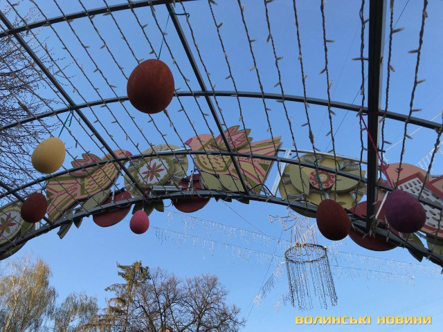 Центральну пішохідну вулицю міста прикрасили арками, писанками та іншими декоративними елементами весняно-великодньої тематики.