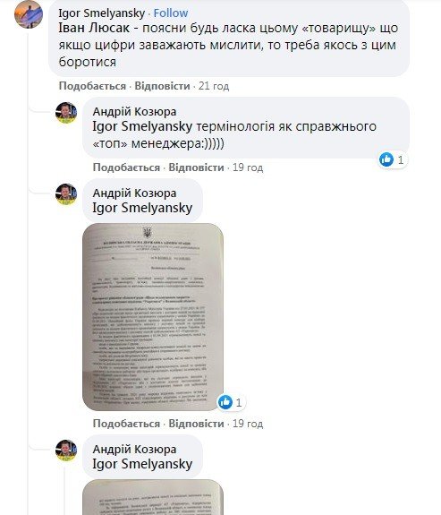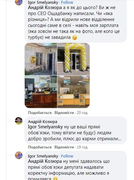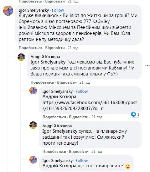 «Я дуже вибачаюсь. Ви ідіот по життю чи за гроші? Ми боремось з цією постановою 277 кабміну, ініційованою Мінсоцем та Пенсійним, щоб зберегти робочі місця та здоров’я пенсіонерів. Чи Вам Юля раптом не ту методичку дала?» - написав він і додав, що його зарплата зовсім не така, як на оприлюдненій картинці. Більше того, він навіть показав нове відкрите сільське відділення.До обговорення Ігор Смілянський запросив і керівника Волинської дирекції «Укрпошти» Івана Люсака.