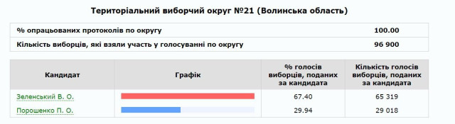 Вибори на 21 окрузі: Зеленський переміг з результатом 67,4 % голосів