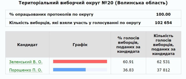 На виборчому окрузі №20, куди входять Горохівський, Локачинський, Луцький, Рожищенський, Турійський райони, обробили 100% протоколів. Явка в на окрузі становила 65,2%. Проголосували 102 654 особи.