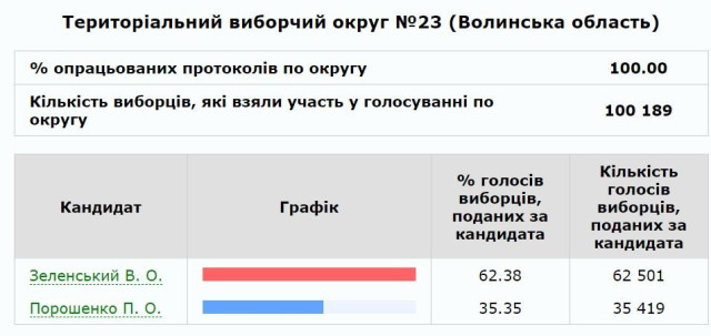 Вибори на окрузі №23: Зеленський виграв, набравши 62,38%