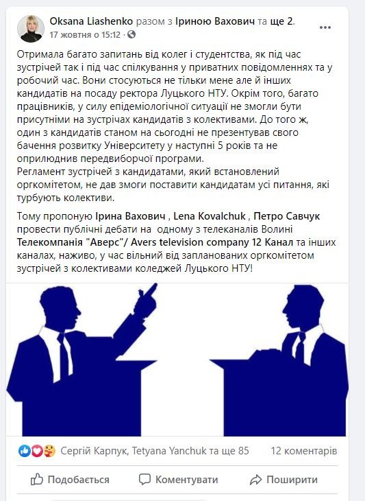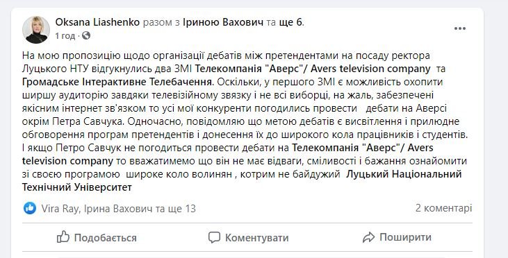 «Оскільки у першого ЗМІ (ТРК Аверс, - ВН) є можливість охопити ширшу аудиторію завдяки телевізійному зв’язку і не всі виборці, на жаль, забезпечені якісним інтернет-зв'язком, то усі мої конкуренти погодились провести дебати на Аверсі. Окрім Петра Савчука. Якщо Петро Савчук не погодиться провести дебати на ТРК «Аверс», то вважатимемо, що він не має відваги, сміливості і бажання ознайомити зі своєю програмою широке коло волинян, яким не байдужий ЛНТУ», - зазначила Оксана Ляшенко.Зазначимо, що задати питання до кандидатів, які будуть дебатувати в ефірі ТРК «Аверс», можна в коментарях під цією публікацією, а також на фейсбук-сторінці ТРК «Аверс».