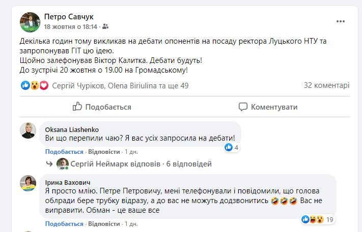 В.о. ректора ЛНТУ Петро Савчук, який бажає вдруге обійняти цю посаду, відмовився від виклику на дебати від кандидатки Оксани Ляшенко. В той час, як кандидатки Оксана Ляшенко, Олена Ковальчук та Ірина Вахович проведуть дебати в ефірі телеканалу «Аверс», Петро Савчук буде одноосібним гостем ефіру «Громадське інтерактивне телебачення» у фейсбуці.