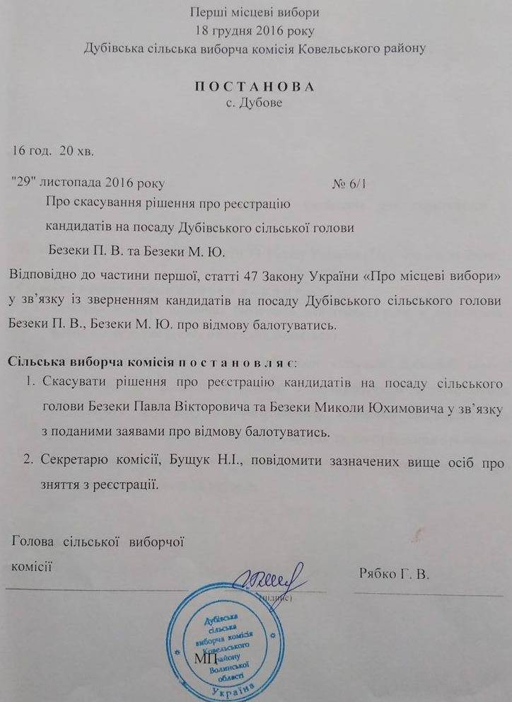 29 листопада Дубівська сільська виборча комісія об’єднаної територіальної громади постановила: «Скасувати рішення про реєстрацію кандидатів на посаду сільського голови Безеки Павла Вікторовича і Безеки Миколи Юхимовича у зв’язку з поданими заявами про відмову балотуватись». Про це йдеться у Постанові № 6/1 виборчої комісії.