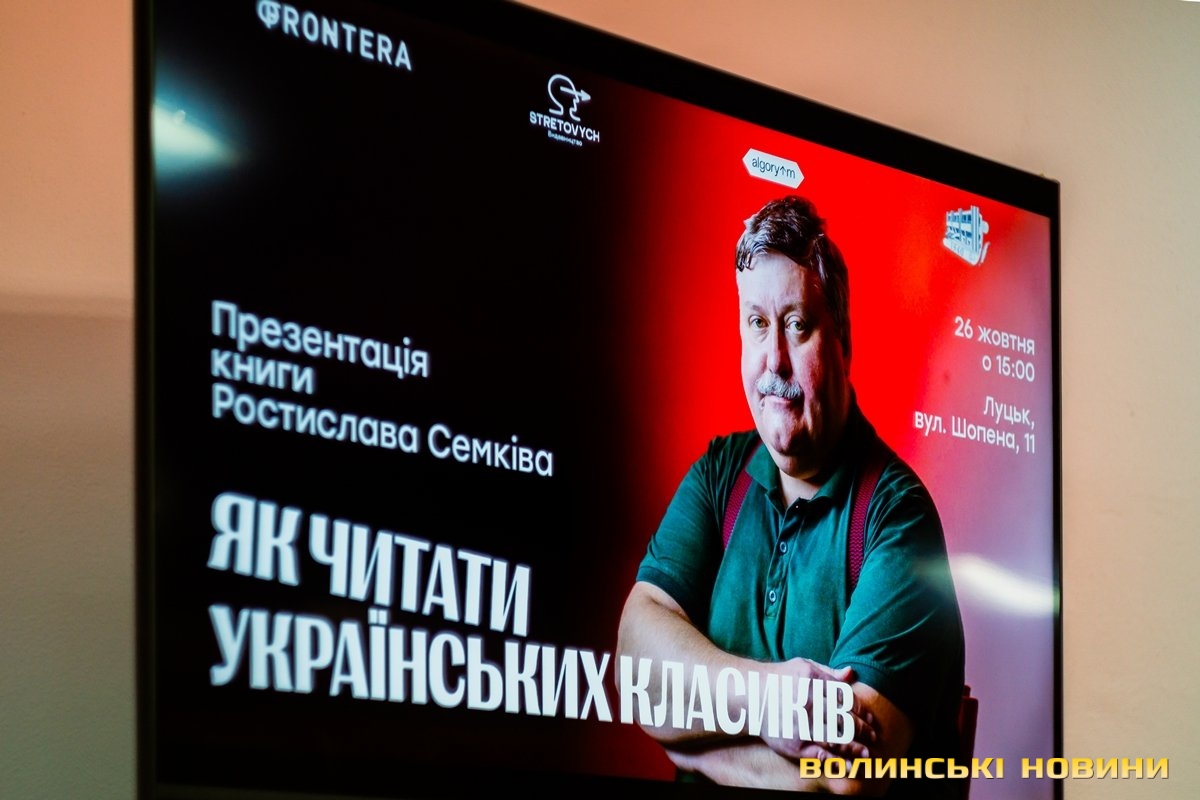 Презентація книги відбулася у соціокультурному просторі «Мистецький» за підтримки проєкту «Фронтера», платформи «Алгоритм дій» та обласної універсальної наукової бібліотеки імені Олени Пчілки.«Ця книжка точно не про пригоди української літератури. Це – практичний посібник. У ньому йдеться про те, що починати потрібно з правильної книги – не завжди найсильнішої у конкретного автора, до якої часом потрібно дорости. А ще – про те, що часом шкільна програма, нагадуючи підбором творів «тунель страждання», відбиває бажання повертатися до літератури. Зокрема української», – пояснює Ростислав Семків.Він пропонує «маршрут» творчістю десятьох письменників-класиків: від Григорія Сковороди до Василя Стуса. Чому саме вони?