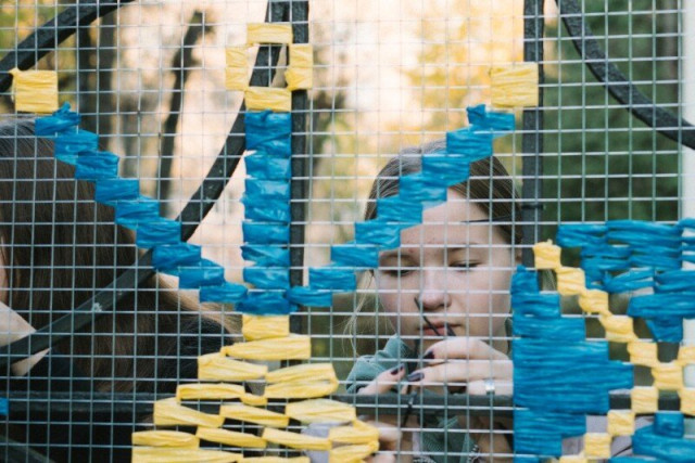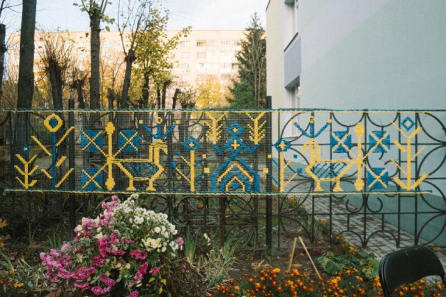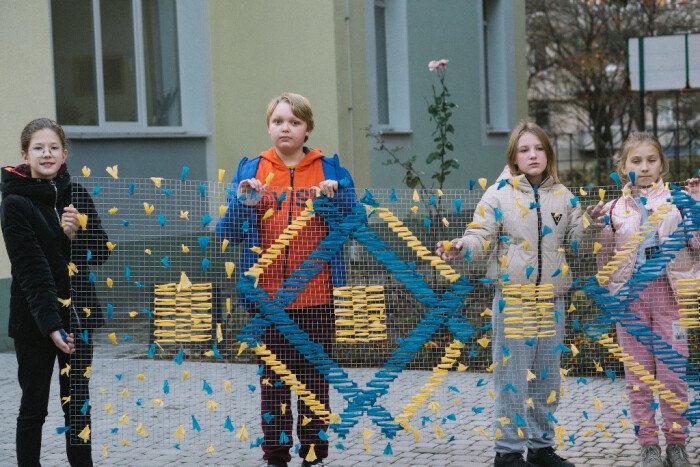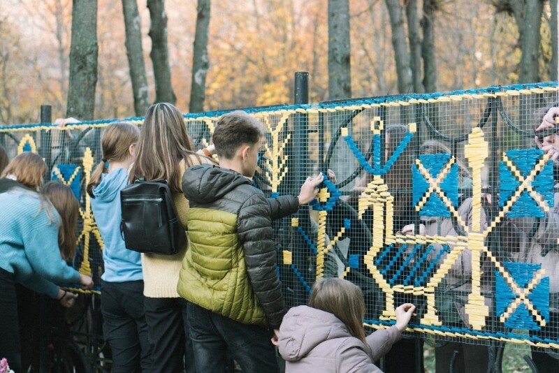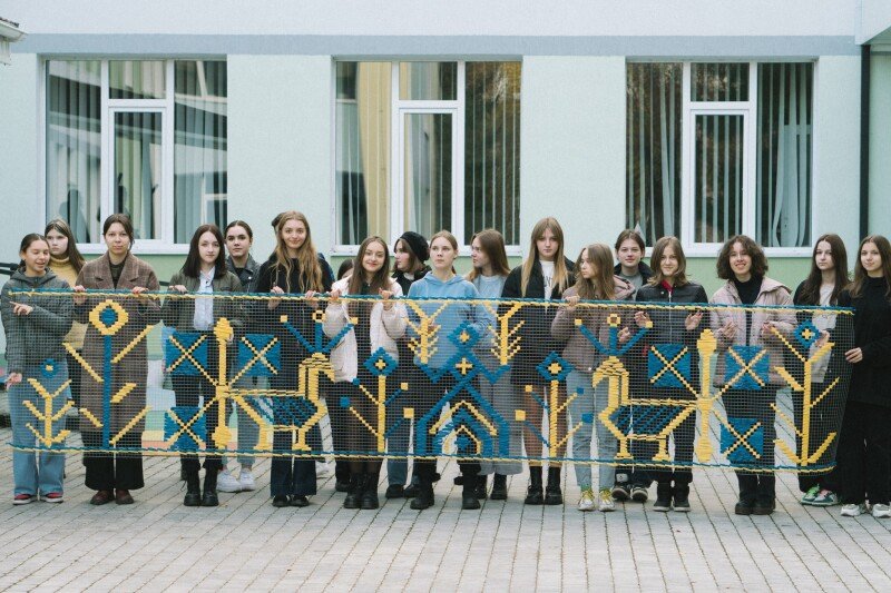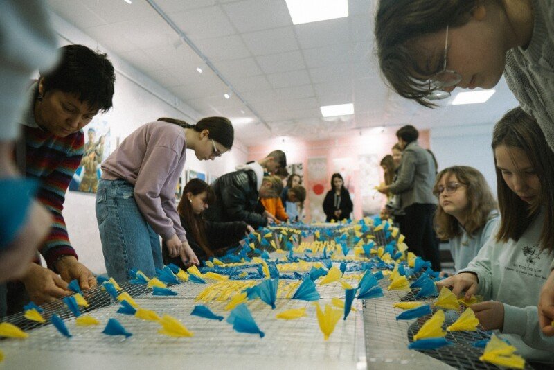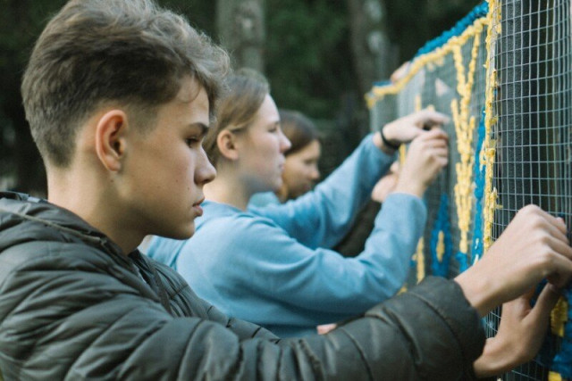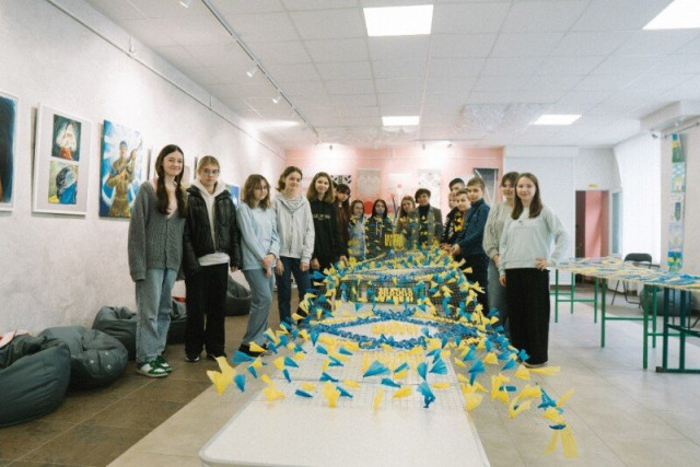 Учасники пленеру під керівництвом арт-терапевтів та викладачів школи створили арт-інсталяцію, використовуючи українські орнаменти, а також жовтий та синій кольори.