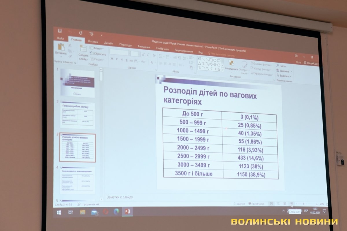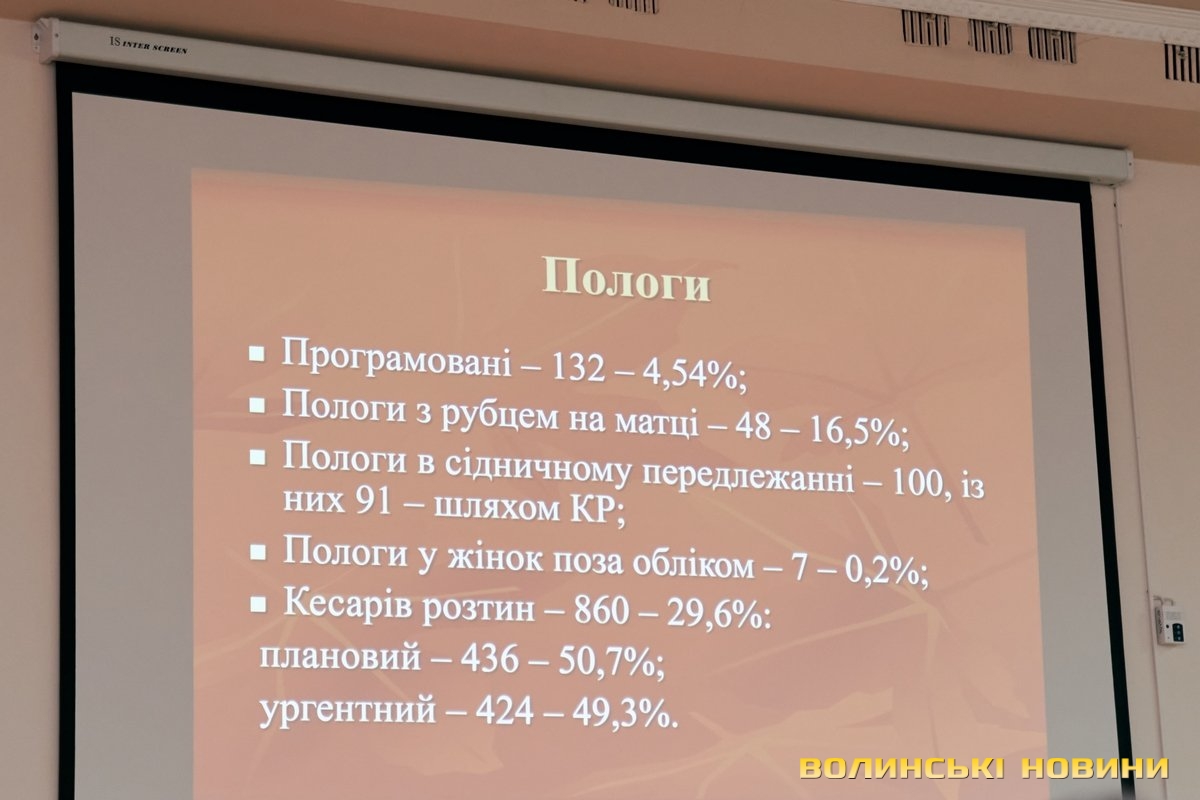 «Це був особливий рік для перинатального центру, – сказала вона. – Порівнювати поки немає з чим, але вже можна сказати, що амбулаторно прийнято 21 тисячу 654 пацієнтки, проліковано в стаціонарі 4 тисячі 788, операцій – 2975, кількість пологів – 2903, кількість новонароджених дітей – 2972, із них недоношених – 243, це приблизно 8%, кесарських розтинів – 29,6%, чим ми пишаємось, тому що для перинатальних центрів це є досить низький відсоток. Проблем було дуже багато, вони і будуть, але їх усі можна розв’язати. А надто, коли є такий високопрофесійний та дружний колектив».
