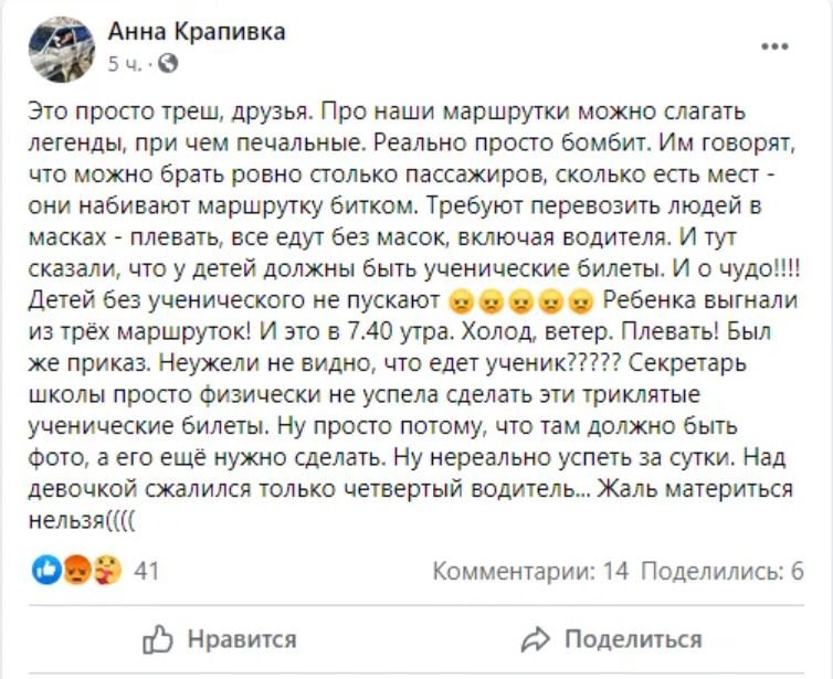 Дочка Анни Кропивки пішла в школу без учнівського квитка, бо школа їх просто не встигла зробити і роздати дітям. Жінка написала, що інші правила водії маршруток без проблем порушують: беруть пасажирів більше дозволеного, пускають людей без масок і самі їх не носять. А ось з дитиною вирішили бути принциповими.«Це просто треш, друзі. Про наші маршрутки можна складати легенди, причому сумні. Реально просто «бомбить»... Сказали, що у дітей повинні бути учнівські квитки. І о диво! Дітей без учнівського не пускають. Дитину вигнали з трьох маршруток!» – обурилася Анна.