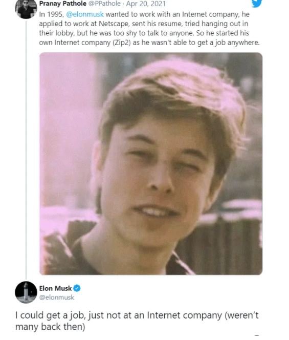 У 1995 році Маск відправив резюме в компанію Netscape, але пізніше заснував власну – Zip2. Однак він не зміг дозволити собі орендувати одночасно офіс і квартиру, тому, запускаючи фірму, зняв тільки приміщення і спав там на дивані.Зі слів Патола, Маск не міг купити собі другий комп’ютер, тому програмував ночами, а веб-сайт працював тільки вдень.
