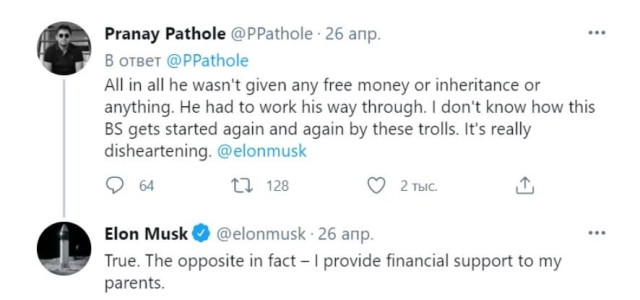 Маск відповів на це в мережі, вказавши, що все вищесказане правда і жодних коштів від батьків він не отримував.