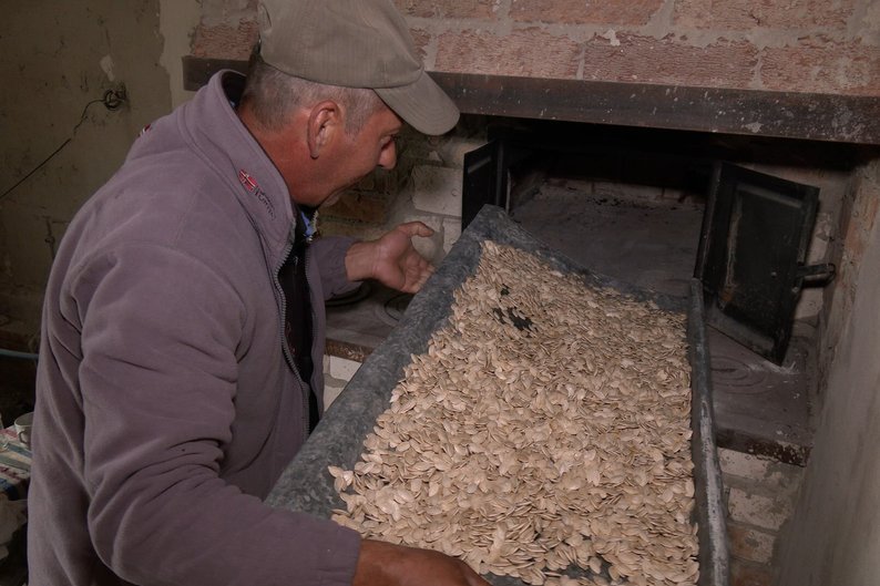 Далі насіння сушать у печі. Цей процес займає шість-сім годин.Вже сухе насіння селяни здають заготівельникам. Як розповів калинівець Микола Сокол, щороку ціна на нього знижується: «Позаторік було до 100 гривень, цього року ціна падає – була 60, вже 50 десь».Після вибирання насіння від плодів залишається гарбузова м’якоть, каші з неї у Калинівці не варять, а віддають худобі. У господарстві годують гарбузами кролів, качок, корів, свиней та коней.