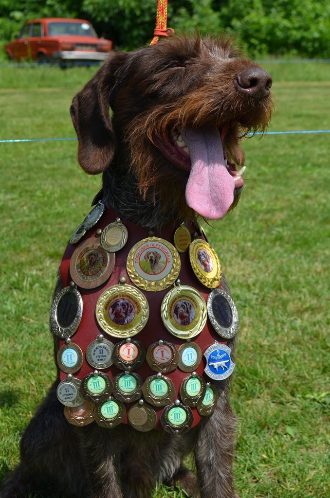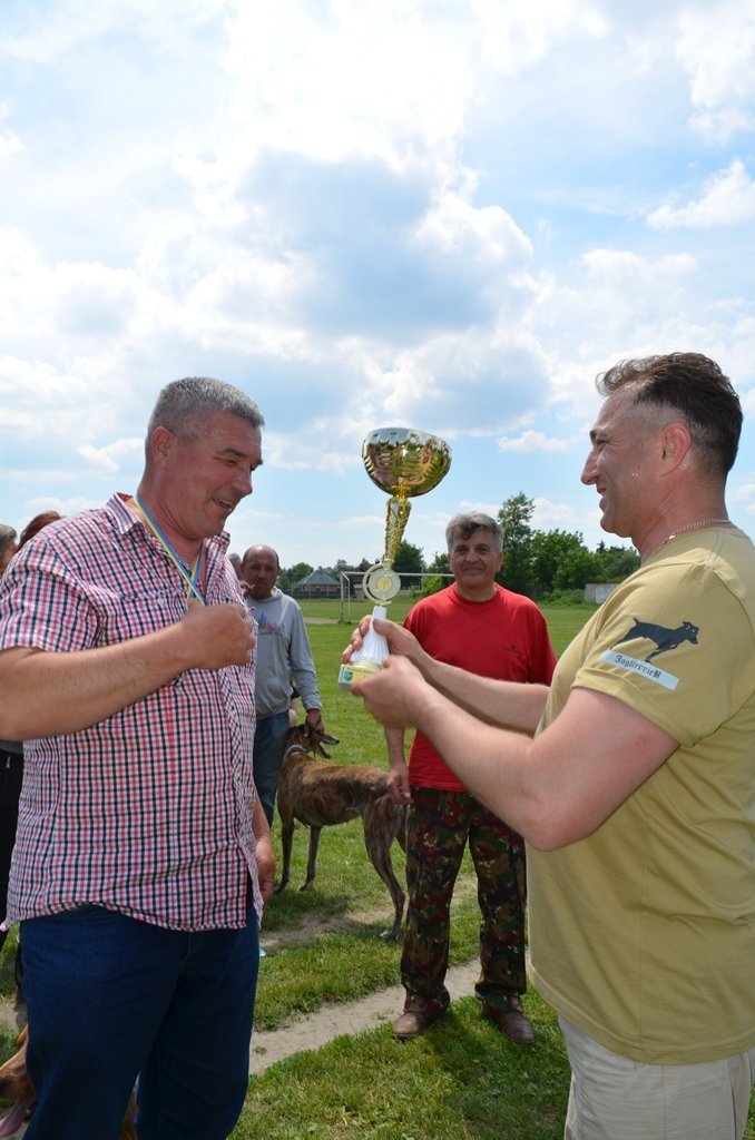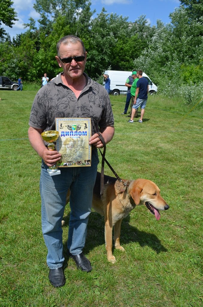 Ця карпатська гонча у складі інших п’ятнадцяти собак-переможців також взяла участь і у битві за головний трофей виставки – кубок «Бестінг-1». Та цього разу у змаганні найкращих переміг епаньол бретон на кличку Атос лучанина Григорія Павленка. Йому і дістався головний кубок Волинської обласної виставки.