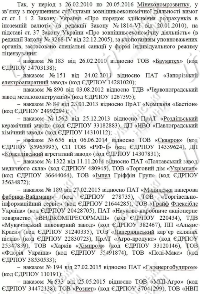 Більшість з юросіб, які фігурують в документі, потрапили до переліку в період 2014-16 років, як підприємства, що мають відношення до РФ або через власників, або як здійснюють підозрілі зовнішньоекономічні операції з Росією, визнаною в Україні країною-агресором.