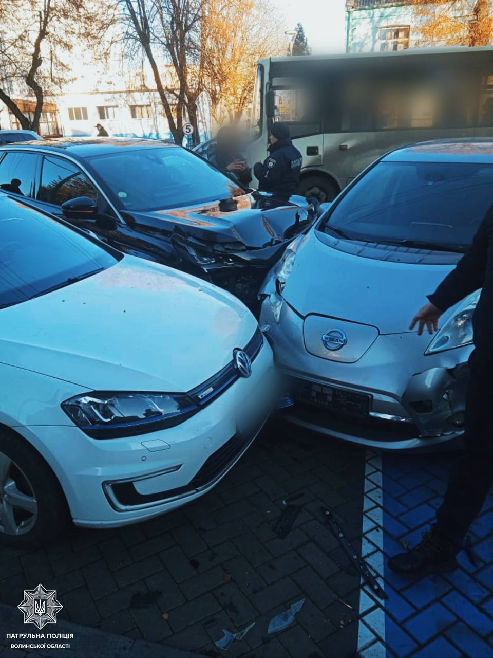 Після цього транспортні засоби допустили зіткнення з припаркованими Volkswagen та Audi, що були розташовані на парковці навпроти будинку на проспекті Волі.