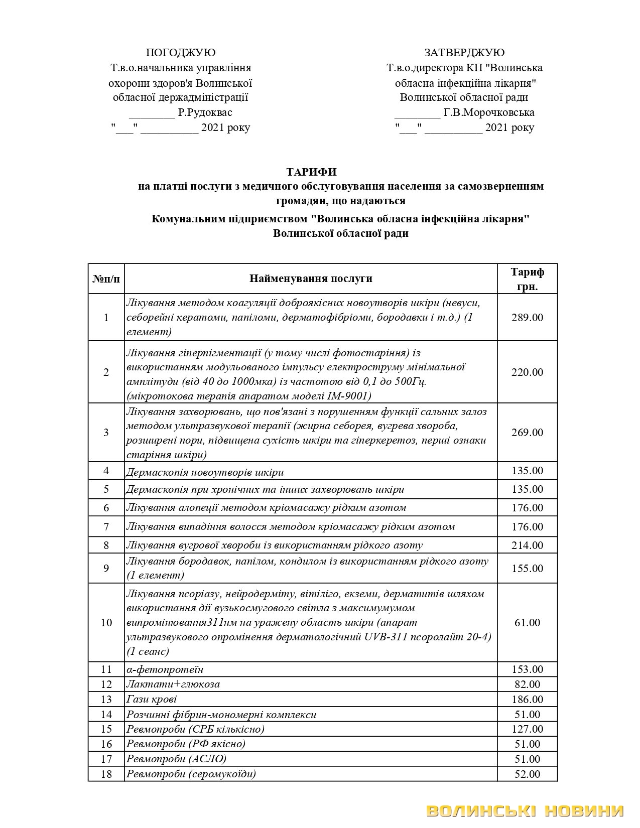 Минулого місяця були затверджені тарифи Волинської обласної клінічної лікарні, Волинського обласного патологоанатомічного бюро, Волинської обласної інфекційної лікарні та Волинського обласного територіального медичного об’єднання захисту материнства та дитинства. Але, як зазначають медики, перелік платних послуг буде доопрацьовуватися.