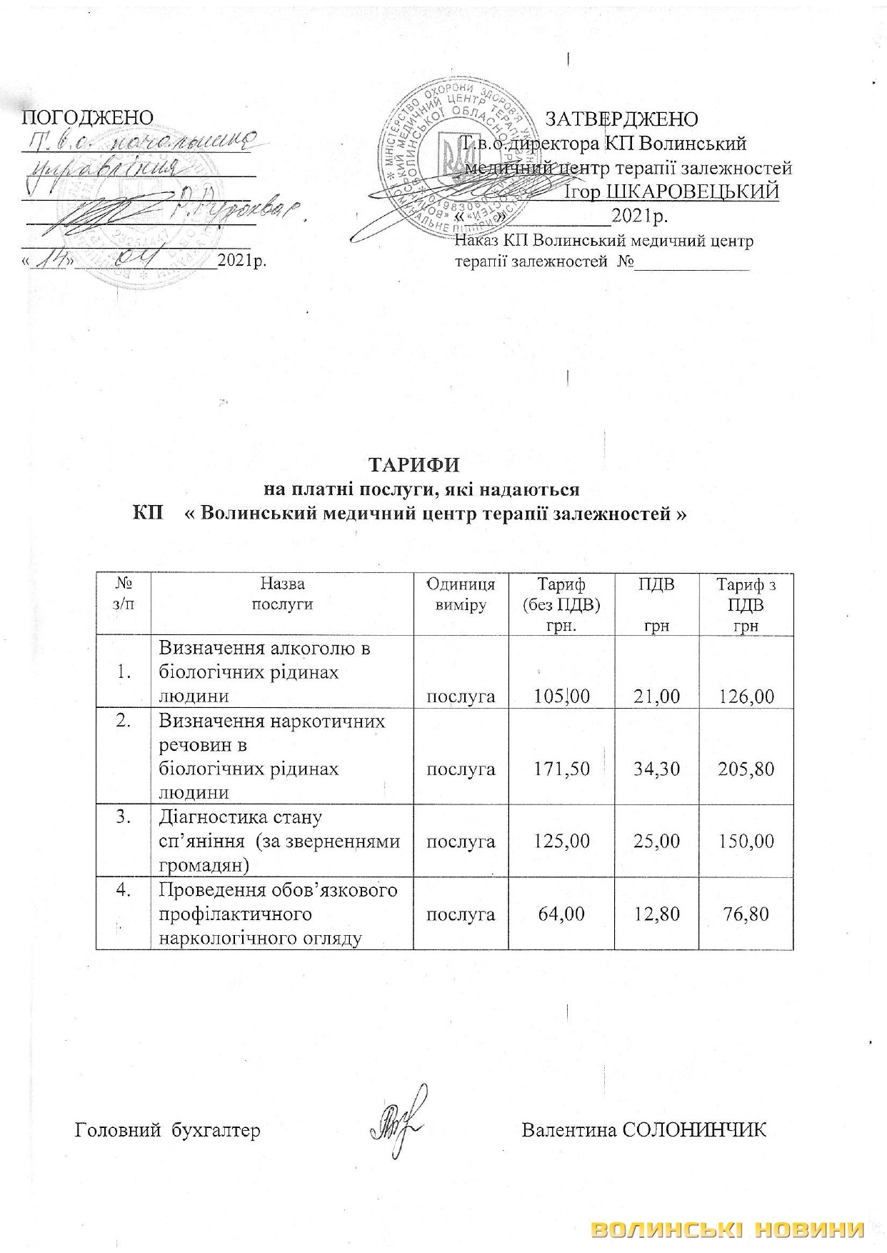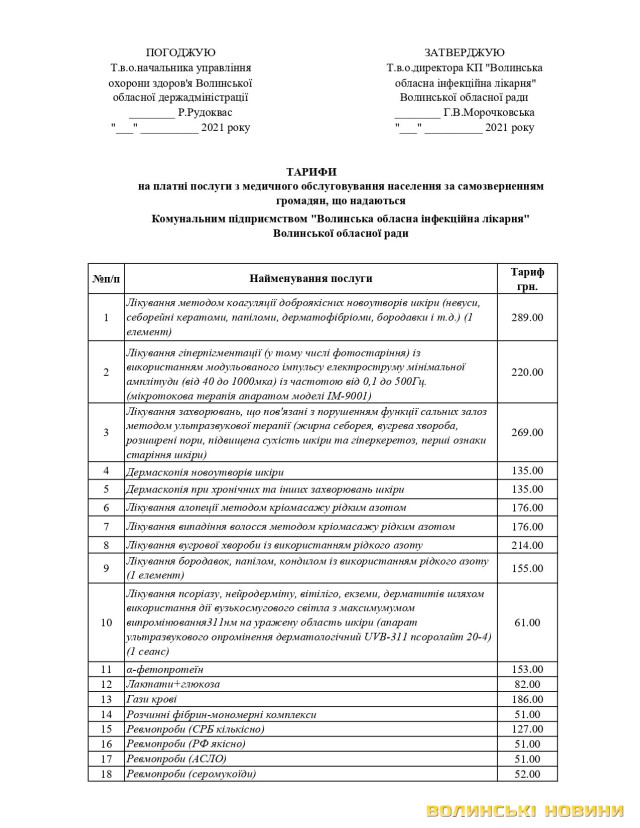 Зокрема 21 квітня подали калькуляцію платних послуг два заклади: Волинська обласна інфекційна лікарня та Волинський медичний центр терапії залежностей.