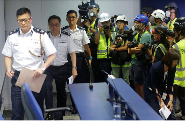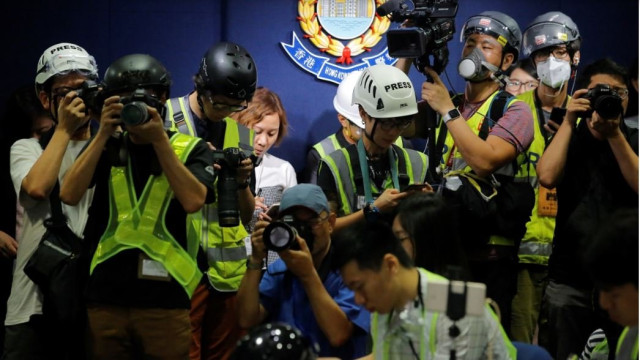 5. Журналістська солідарність: представники ЗМІ прийшли на прес-конференцію поліції в шоломах, захисних дихальних масках та жовтих жилетах, висловлюючи солідарність із демонстрантами та власний протест проти застосування сили щодо людей на вулицях Гонконгу. Днем раніше поліцейські використовували сльозогінний газ, гумові кулі та палиці проти учасників акцій протесту.