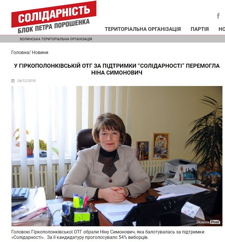 Голова ОТГ ні словом не згадала БПП «Солідарність», волинський осередок якої підтримав її кандидатуру і одразу заявив про її перемогу на виборах ОТГ на своєму сайті.Симонович записали до своїх лав і в прес-службі всеукраїнської «Солідарності». Так, з 9 голів, які балотувалися на посади голів ОТГ на виборах 23 грудня, 8 – члени партії та самовисуванці, яких підтримували партійні організації БПП. До слова, дев’ятий голова ОТГ – очільник Війницької ОТГ у Локачинському районі, укропівець Сергій Вербицький.