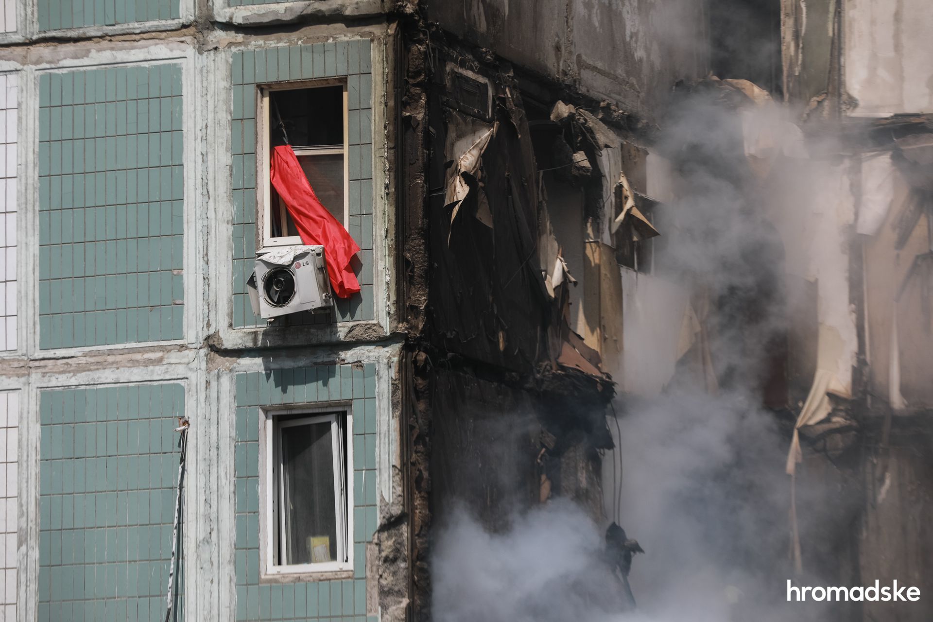 Язики полумʼя були просто біля дверей, згадує Дмитро Васильович перші хвилини після вибуху. Тоді він почув плач маленької доньки сусідів, вона була ще жива після вибуху, поки частина верхніх поверхів не обвалилася:
