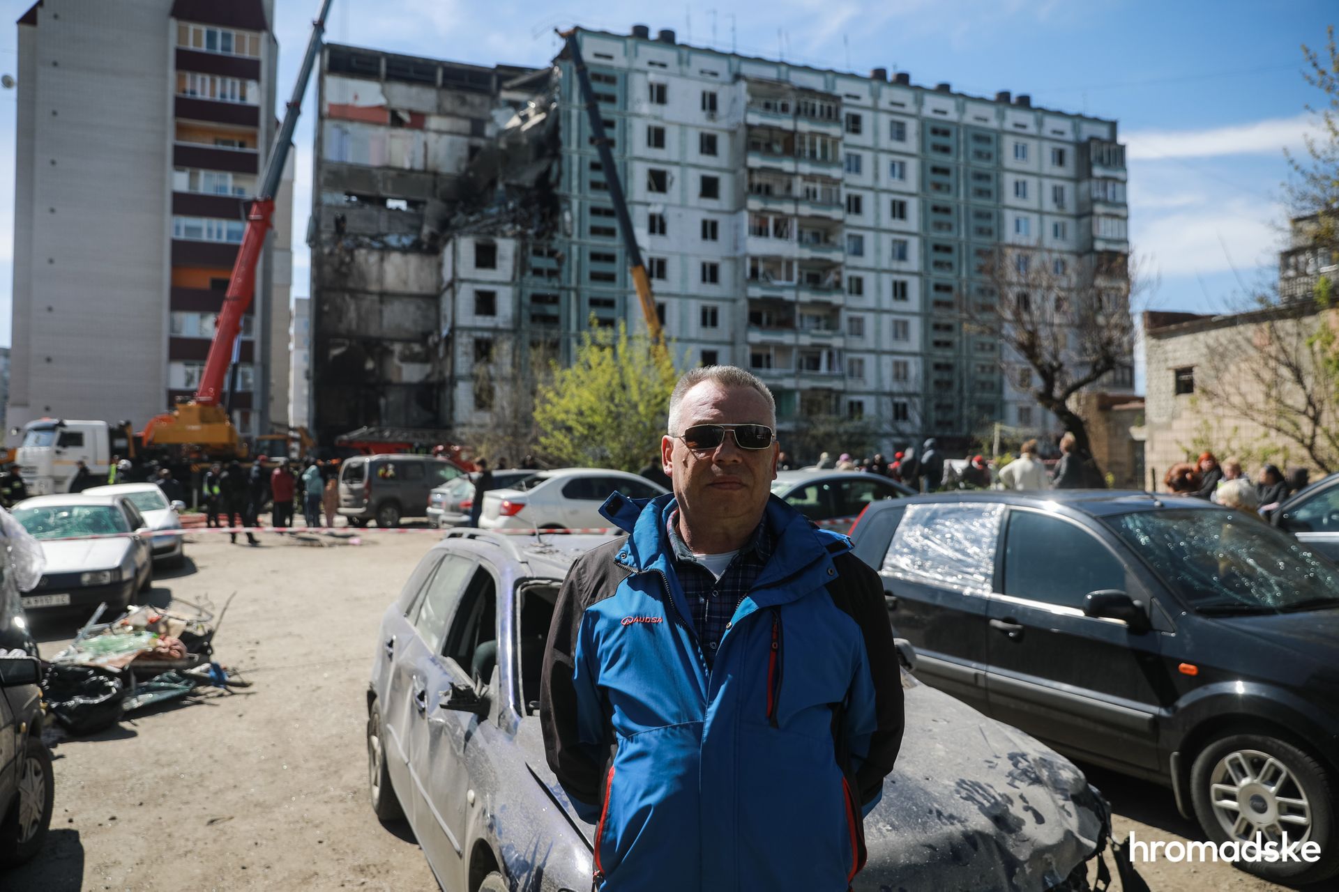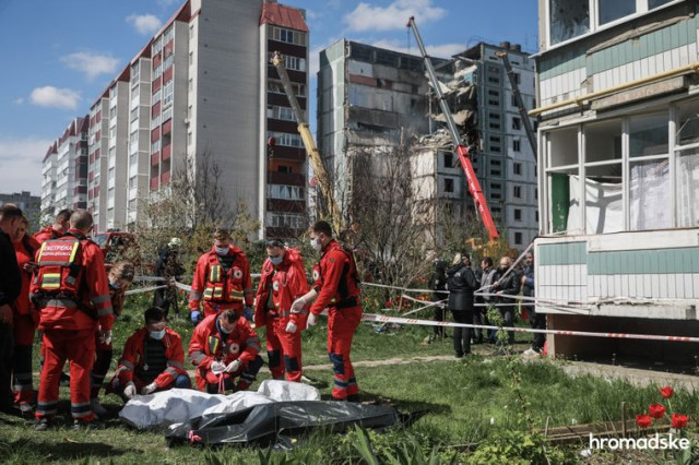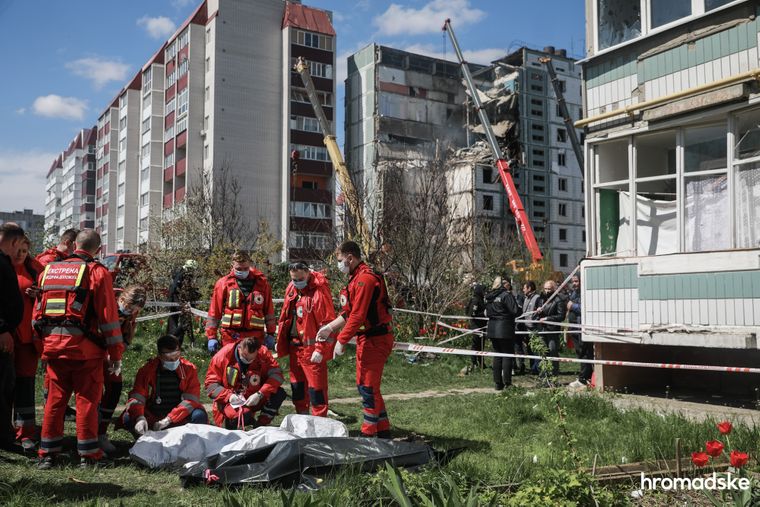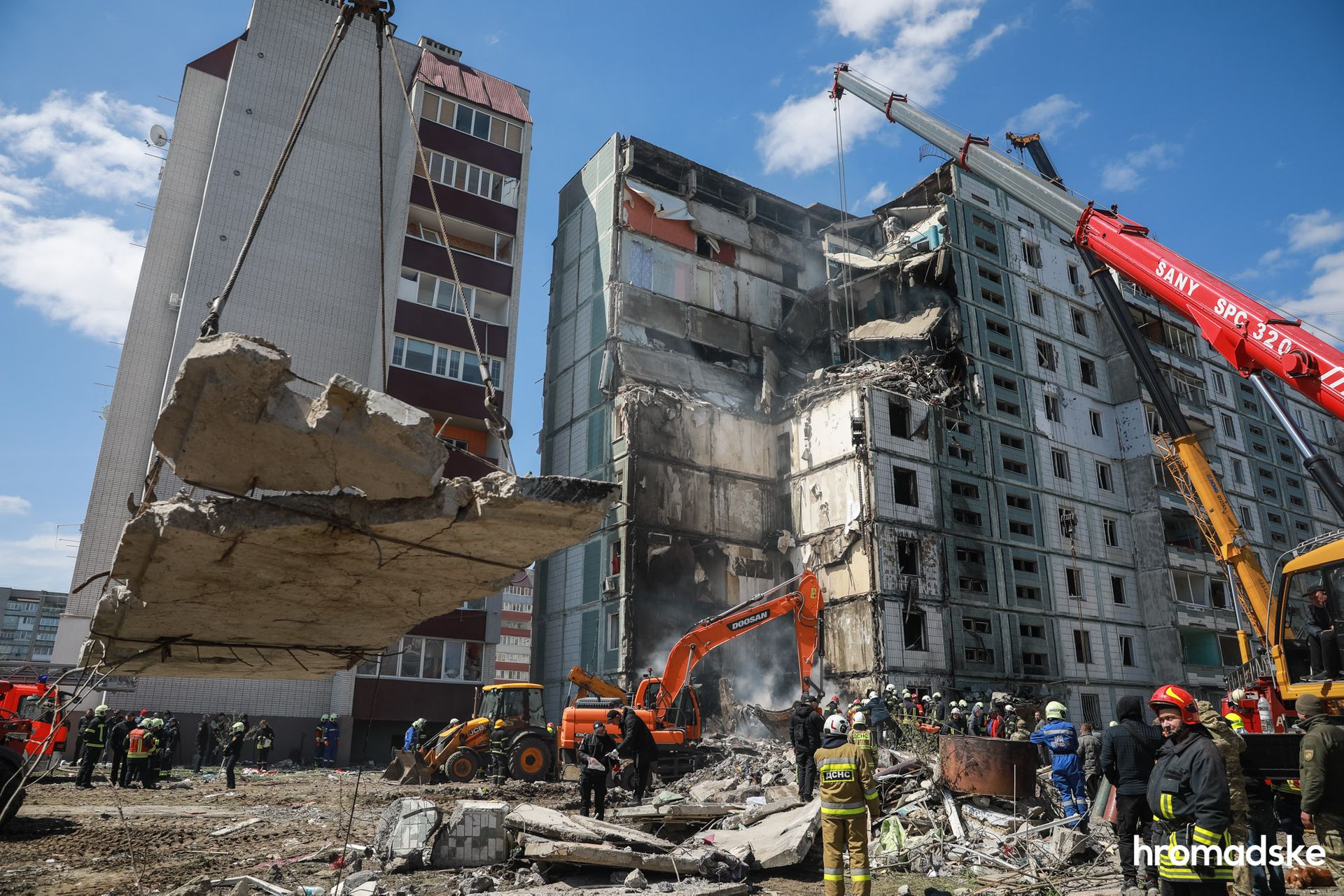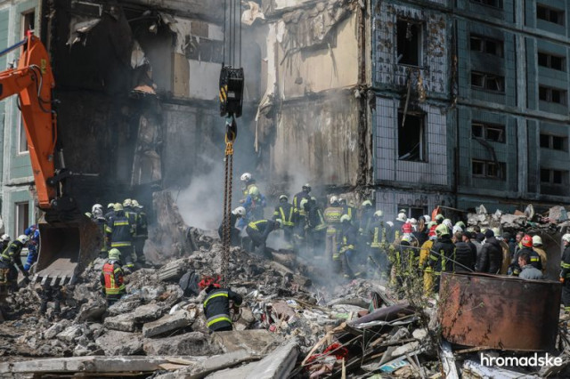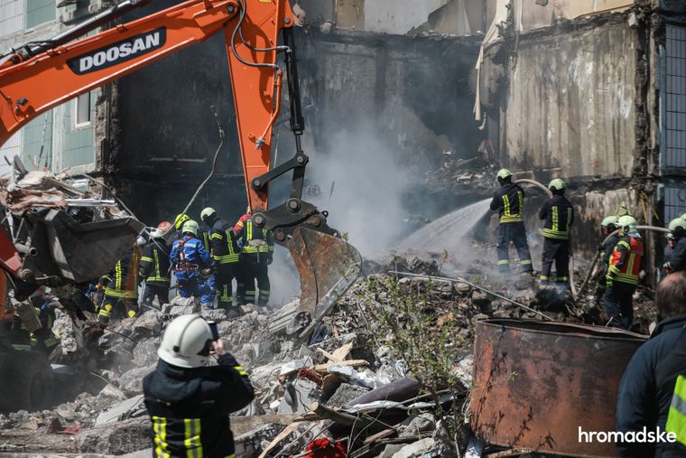 Під зруйнованим будинком — мурашник із рятувальників, поліції, будівельної техніки та пожежних автомобілів. Навіть здалеку добре видно, як техніка пригальмовує свою роботу, коли поміж руїн проглядаються можливі ознаки людини. Туди сходяться ледве не всі рятувальники і тепер уже вручну розкопують бетон і скло.