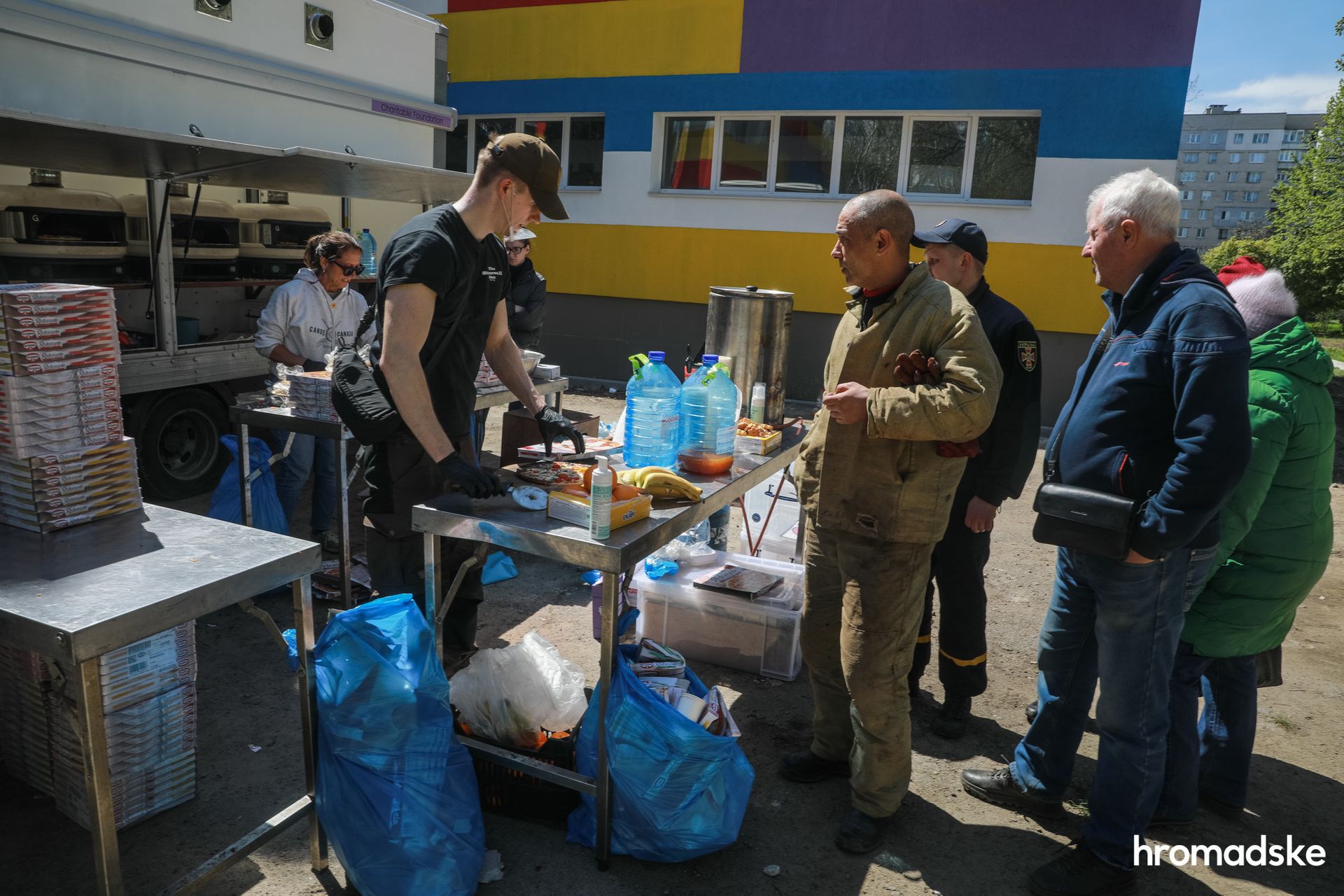 Трохи далі навколо будинку розмістилися кілька груп волонтерів, які допомагають усім охочим із водою, їжею і теплом.