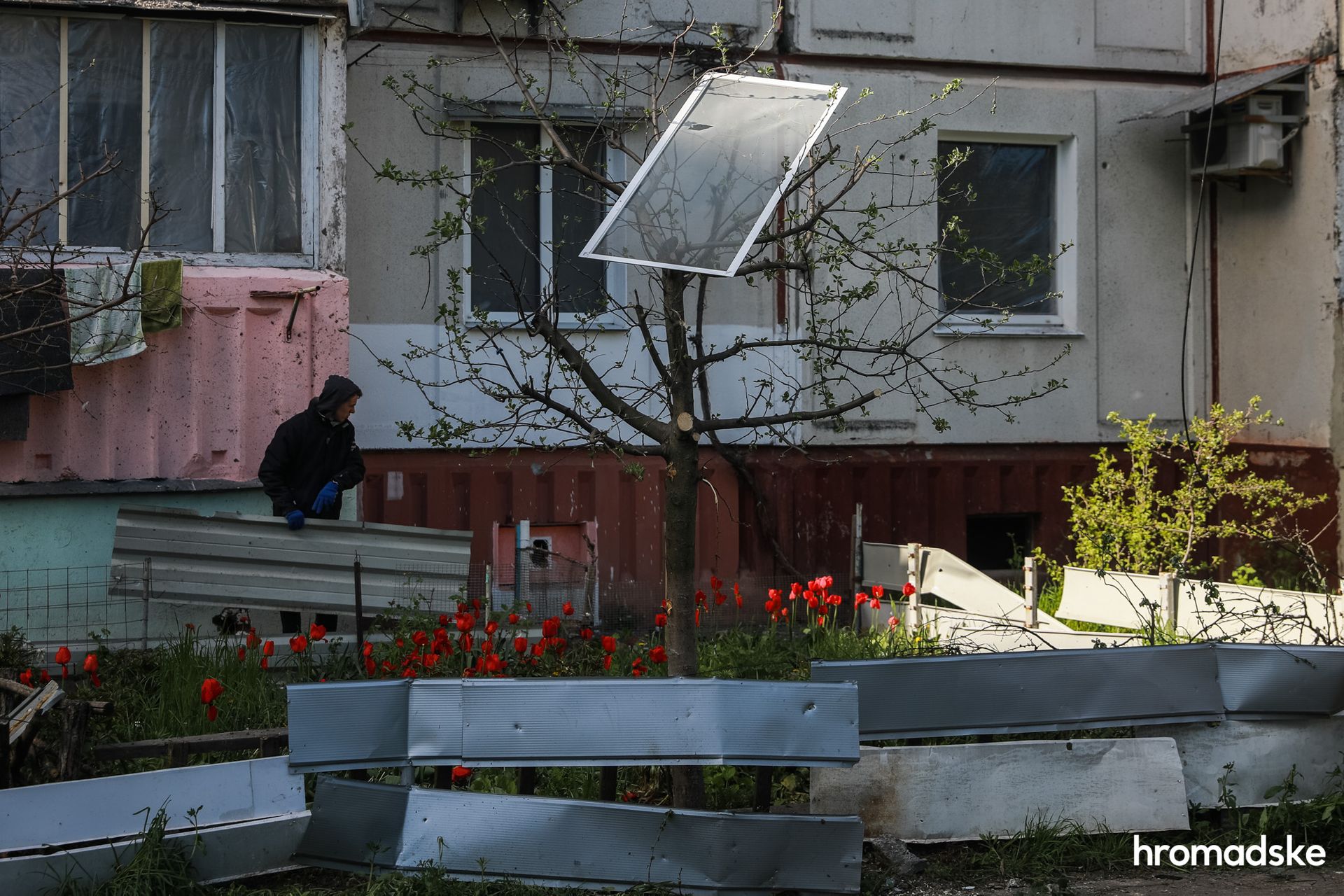 Загиблих відносять до галявини біля сусіднього будинку. Тут серед буйної зеленої трави і яскравих тюльпанів медики коротко оглядають тіла, перш ніж повантажити їх у швидкі і відправити до морга.