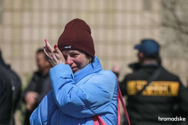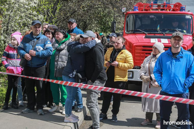 Ще далі за обмежувальною смугою помічаю групу жінок, які напружено стежать за діями медиків. Раптом одна з них притуляє руки до обличчя — серед знайдених тіл хтось із її близьких. Її тихий плач швидко переходить у надривний крик і вже за хвилину її підхоплюють під руки і відводять убік троє інших медиків, побоюючись, що жінка зараз просто втратить свідомість. Присутність журналістів тут максимально недоречна, тому я роблю одне швидке фото і повертаюся до зруйнованого будинку.