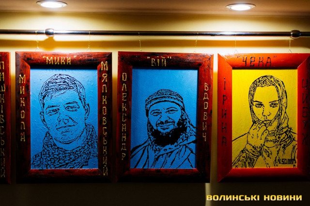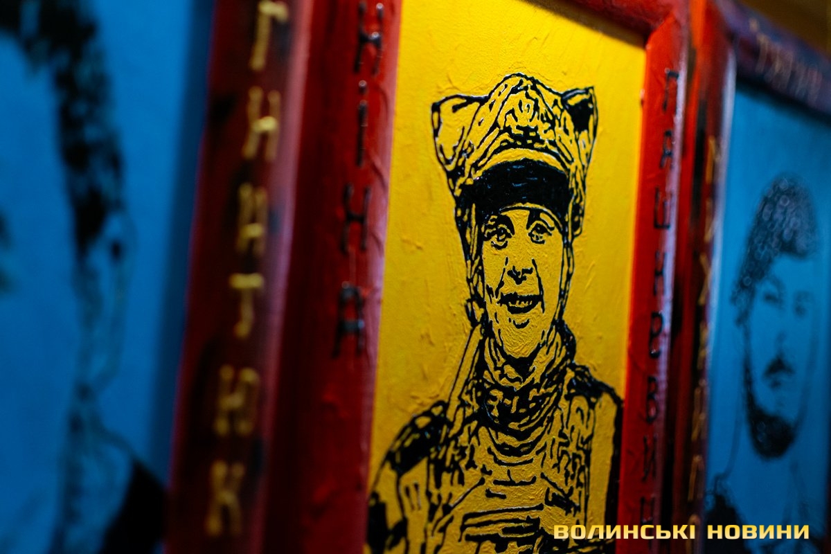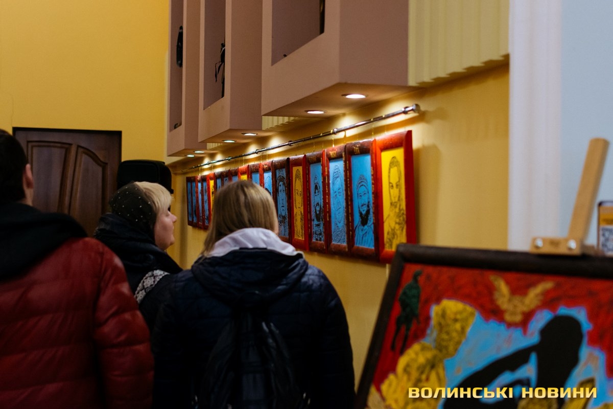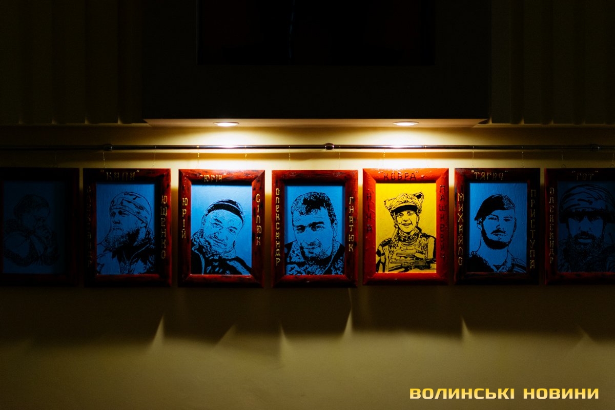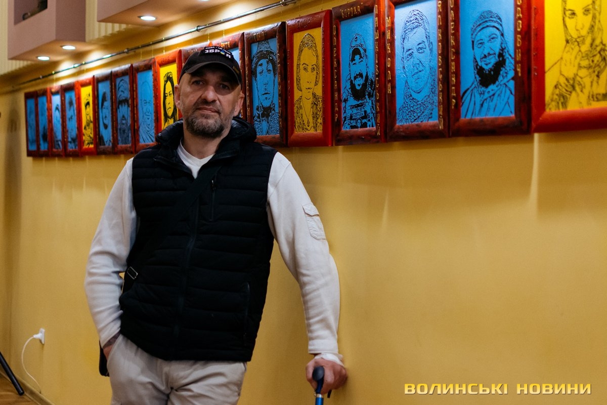 «Ніколи не вмів малювати, не любив малювати, – зізнається Руслан. – Пензля мені в руки вклав Бог, коли я після восьми місяців мовчання – наслідок контузії – почав відновлюватися».Справді, шлях воїна до усвідомлення власного покликання був надзвичайно складним і болісним. Він – учасник Майдану, солдат АТО/ООС знову пішов воювати у 2022 році. У складі батальйону «Айдар» побував на найважчих ділянках фронту, був поранений, мав важку контузію… Віра в Бога і мистецтво, як зізнається, не лише повернула мову, але й дає сили жити, зцілює, надихає допомагати іншим. А ще прийшло усвідомленням власної місії – зробити все, аби про цю війну не забули.«Я тоді довго мовчав – після 2014. Вісім місяців. Потім якісь звуки почав видавати і пробувати малювати. Вчився щось потрохи… В мене все прив’язане до сакрального – духовне, військове, історія. А перші портрети почав малювати, бо в мене був страх, що історія знову зміниться і все це забудеться. Так вже було. Я знаю, як все забувається і переписується – малим читав із захопленням про «подвиги» партизанів, які боролися з бандерівцями. А вже потім почав дізнаватися, як все було насправді», – розповідає Руслан Кашаюк.З того часу художник створив дуже багато зображень. На одних – миті війни, інші – сповнені релігійного сенсу. Окремо вирізняється серія портретів побратимів – живих і померлих. Ці своєрідні ікони пам’яті, які з іменами-прізвищами та позивними, і представлено на виставці. А ще суголосне зображення Страстей Христових – шляху Спасителя на Голгофу, як мучеництва заради порятунку інших.Читати ще: Молилися на колінах: на стінах волинського храму розвісили портрети Героїв, які намалював військовий