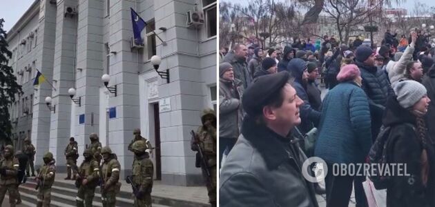 Відповідне відео з’явилося у Telegram нардепа Олексія Гончаренка, пише Обозреватель. На кадрах видно окупантів, на одному з них виразно помітний білоруський прапор. Натовп жителів, що зібрався під адмінбудівлею перед озброєними окупантами, скандував: «На**й! Додому!»