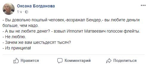 "Мій кіт теж не любить сметану", "Бабло - це зло", "Готовий допомогти людині. Вивезу всі гроші. Безкоштовно", "Ось чого не відняти у нашого Президента - так це його артистичність", "Гумор Петра Олексійовича - безцінний", "Не уточнив які - українські чи американські", - коментують висловлювання президента в мережі.