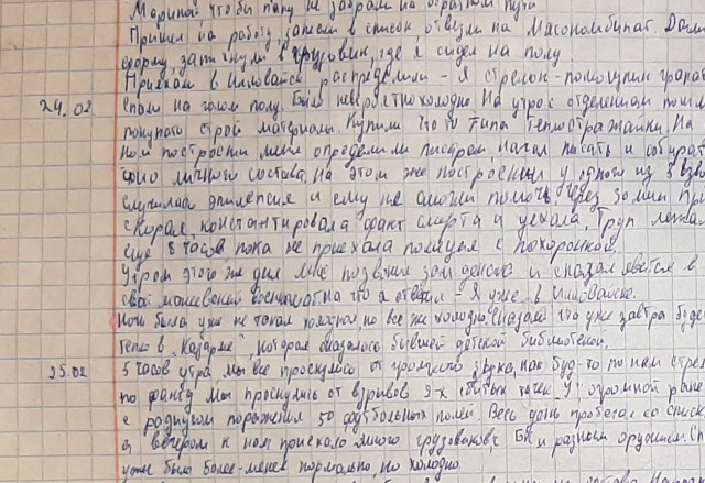 «24.02. Спали на голом полу. Было невероятно холодно. На утро отделением пошли покупать строй материалы. Купили что то типа теплоотражайки. На дневном построении меня определили писарем, начал писать и собирать фио личного состава. На этом же построении у одного из 3 взвода случилась эпилепсия и ему не смогли помочь. Через 30 минут приехала скорая, констатировала факт смерти и уехала. Труп лежал еще 8 часов, пока не приехала полиция с похоронкой.