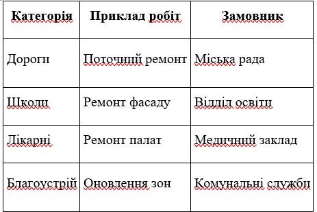 Коли переглядаєш статистику, стає зрозуміло, які напрями стоять на першому місці. У багатьох населених пунктах головною потребою є дороги. Саме цю сферу видно у великій кількості закупівель. Також будівлі місцевого значення мають досить значні потреби. Школи та лікарні часто отримують необхідні суми, бо потребують оновлення та ремонту. Це формує основний спектр робіт у громадах кожної області. Щоб показати це структуровано, можна розглянути таблицю, у якій збираються типи робіт і замовники. Це створює повну картину сфери.